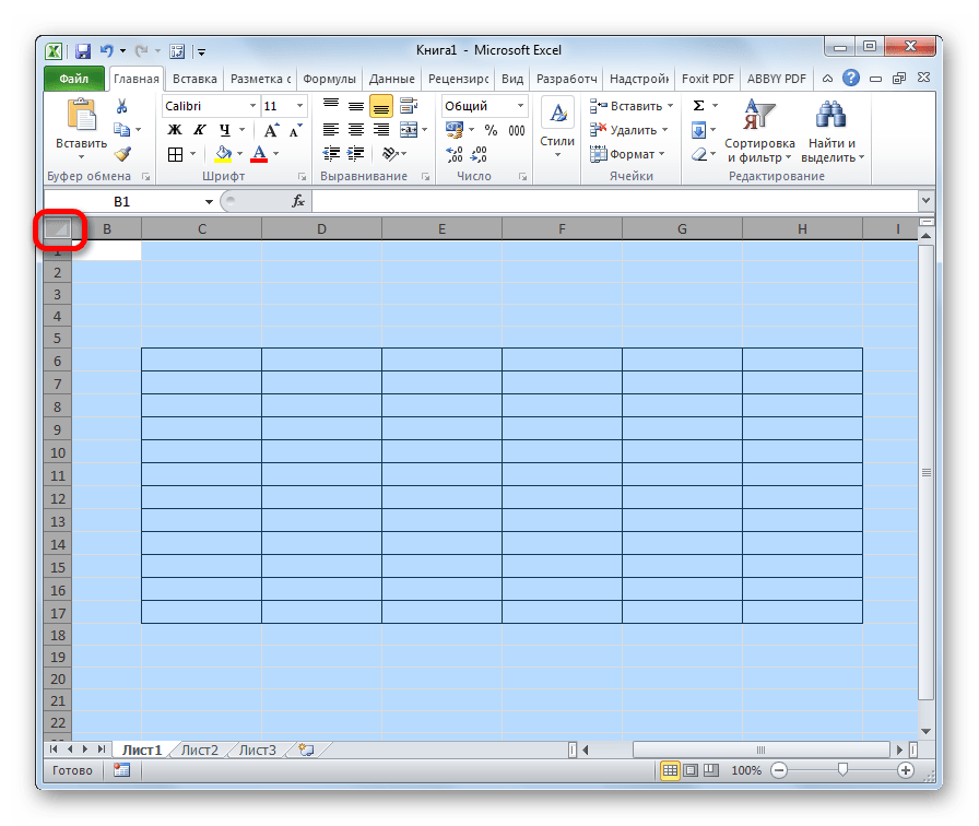 - Кликаем по прямоугольнику, расположенному между горизонтальной и вертикальной панелями координат. Как видим, после этого весь текущий лист выделяется полностью. Существует и альтернативный способ выделения всего листа. Для этого просто набираем на клавиатуре сочетание клавиш Ctrl+A.