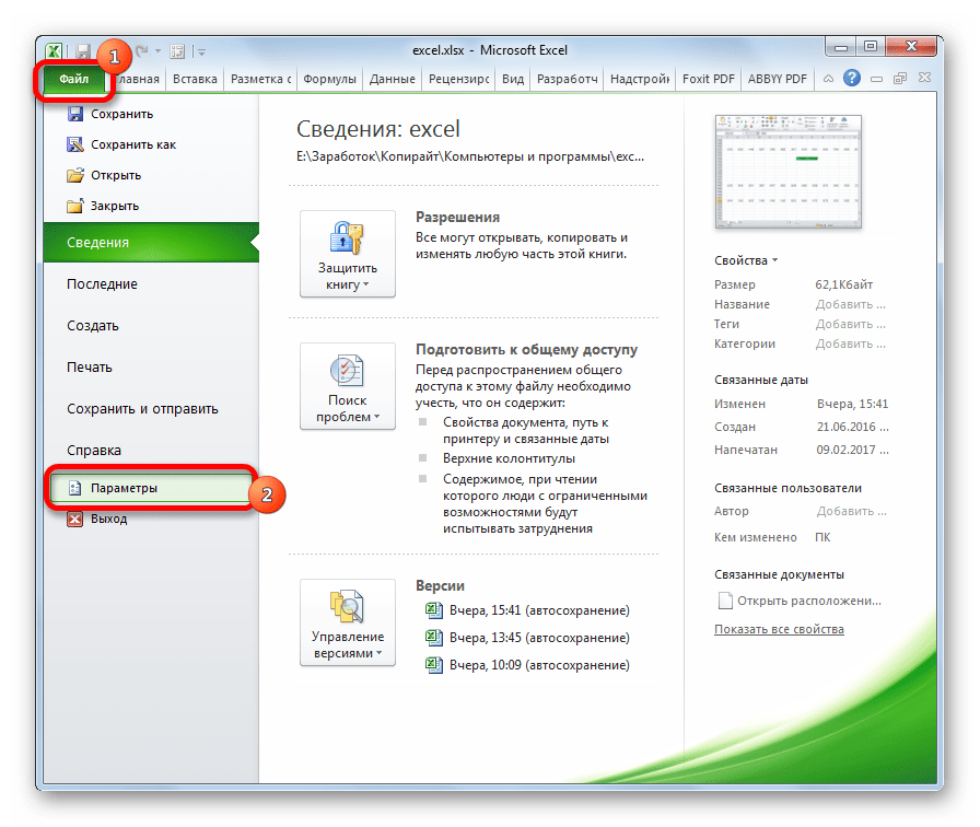- Находясь во вкладке «Файл», жмем на пункт «Параметры».
