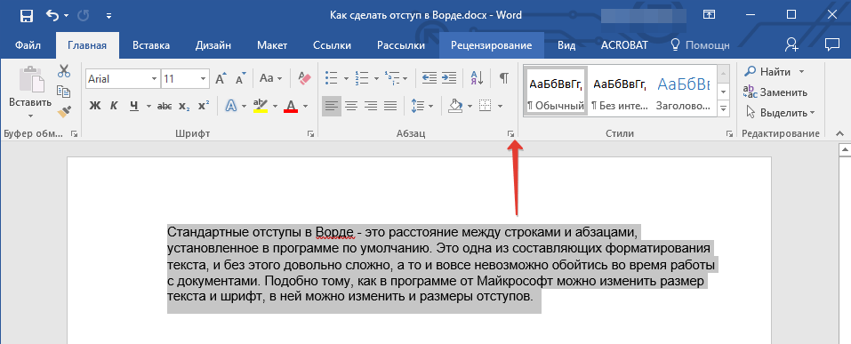 Для того чтобы настроить интервалы между абзацами в документе, на вкладке «Главная» в разделе «Абзац» кликните по маленькой стрелочке в правом нижнем углу.