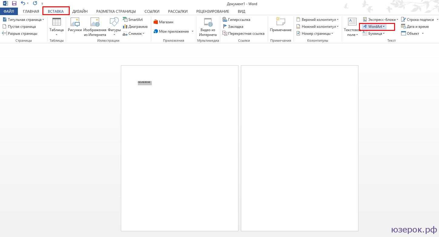 4. Осталось дело за малым — сделать нужную надпись для объявления в Ворд. Вы можете использовать обычный текст или WordArt. Для этого перейдите во вкладку «Вставка» и выберите WordArt. Здесь вы можете выбрать различные готовые оформления для шрифтов.