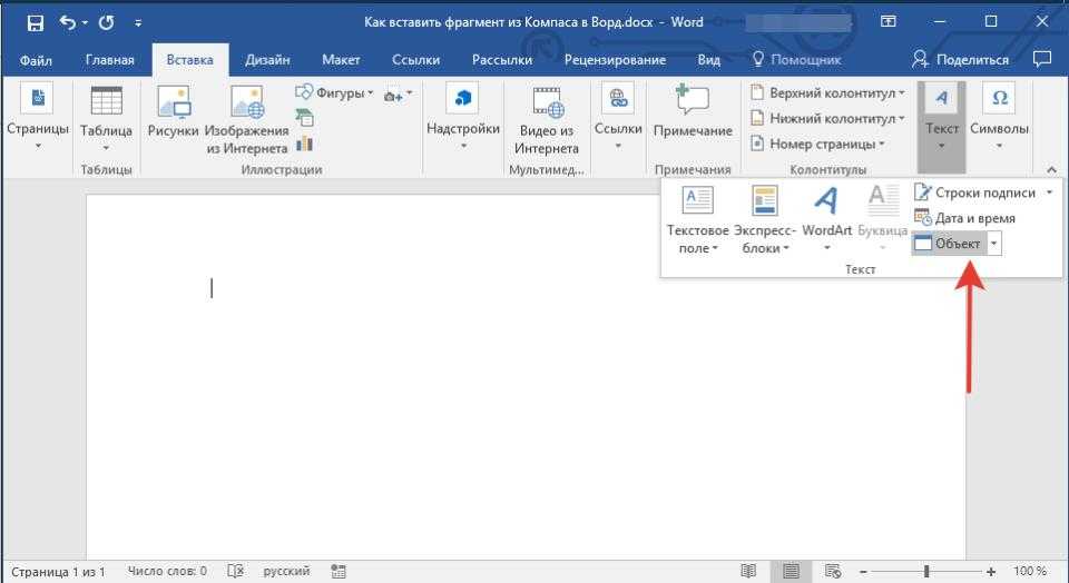 Устанавливаем курсор в требуемое, для вставки место документа и нажимаем вкладку Вставка – Объект.