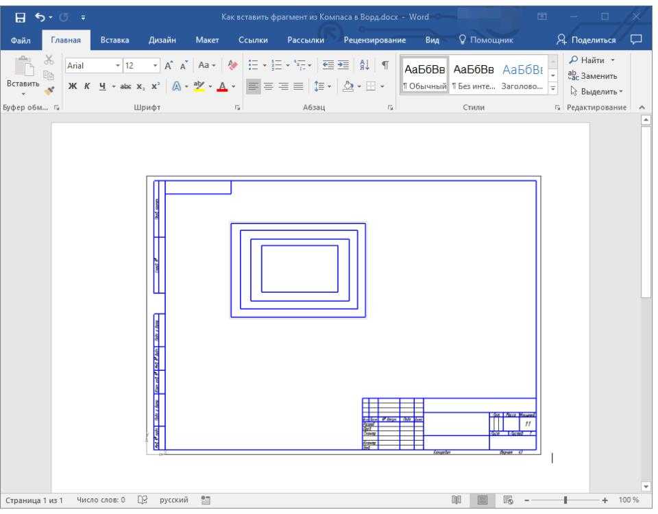 Примечание: Данный метод тоже исключает возможность редактирования вставленного объекта. То есть, вы сможете изменить его, как и любой рисунок в Word, но не сможете редактировать, как фрагмент или чертеж в Компасе.