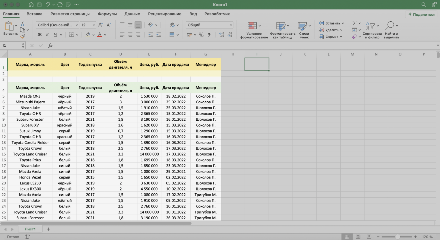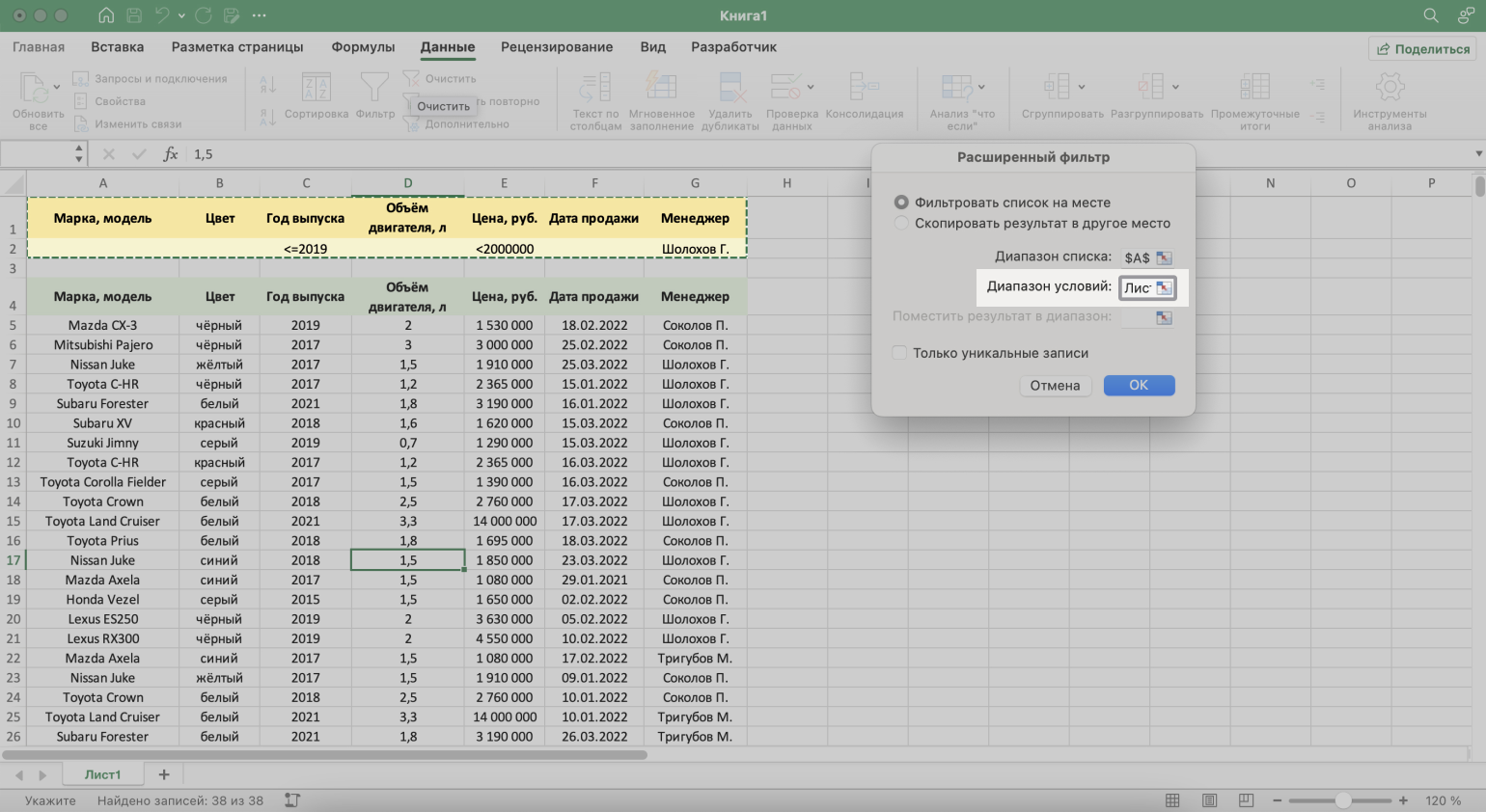 Готово — исходная таблица отфильтрована по трём заданным параметрам.