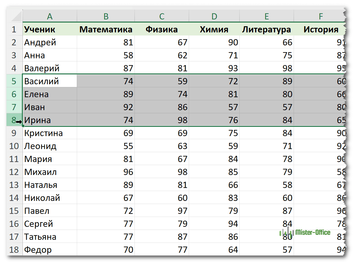 Другой вариант — щелкнуть любую ячейку в данной строке, а затем нажать сочетание клавиш Shift + пробел. Эта комбинация клавиш позволяет без особых усилий выделить всю строку, независимо от вашего текущего положения в строке.