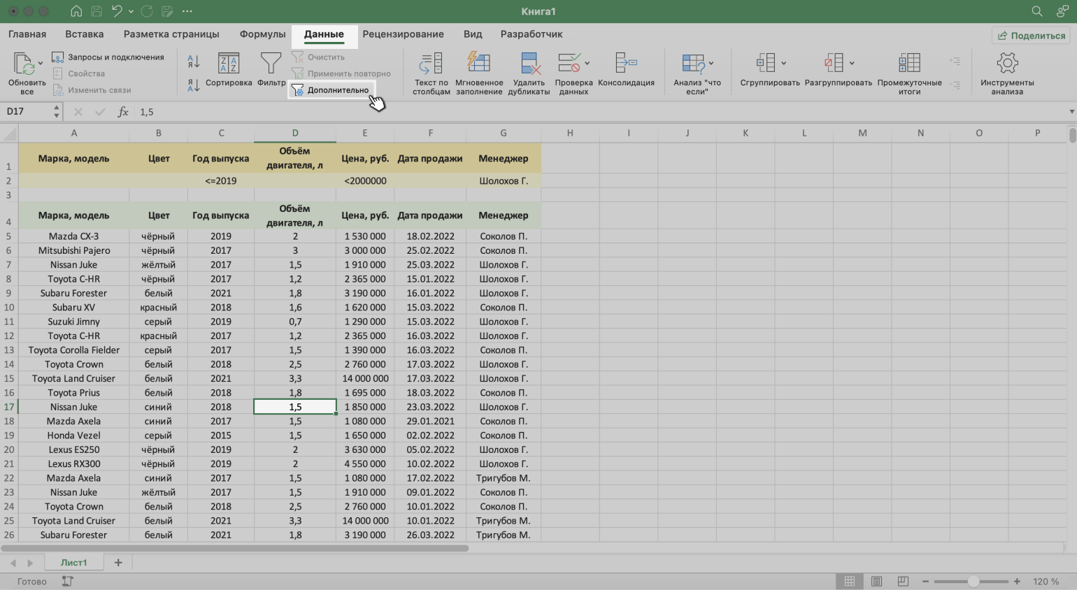 Шаг 3. Выделяем любую ячейку исходной таблицы и на вкладке «Данные» нажимаем кнопку «Дополнительно».