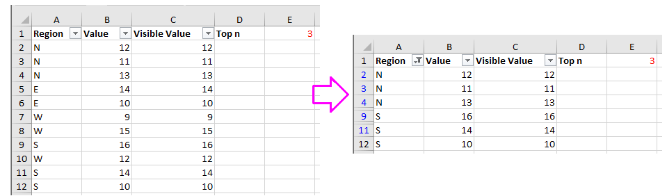 Если вы хотите выделить первые n значений только в видимых ячейках, например, выделить 3 первых значения в видимых ячейках списка, вы можете сделать следующее: