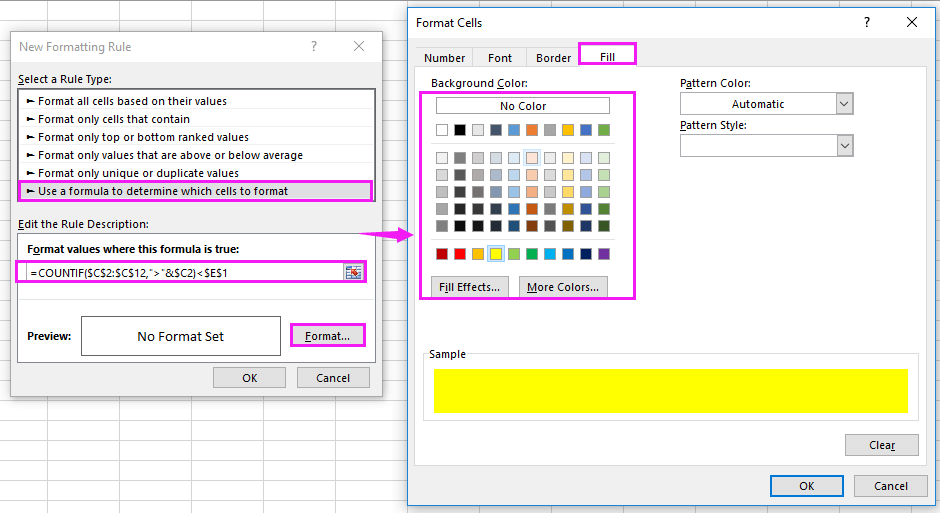 4. Выберите отфильтрованные ячейки формулы, C2: C12, и щелкните Главная > Условное форматирование > Новый руле. И в появившемся диалоговом окне выберите Используйте формулу, чтобы определить, какие ячейки следует форматировать., и введите это = СЧЁТЕСЛИ ($ C $ 2: $ C $ 12, «>» & $ C2) <$ E $ 1 в текстовое поле, а затем щелкните Формаt выбрать один цвет под Заполнять вкладка для форматирования ячеек. Смотрите скриншот: