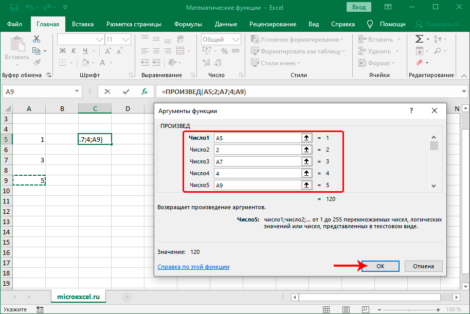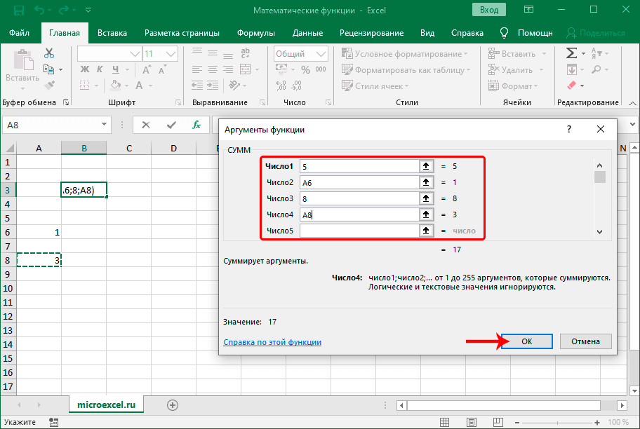 В аргументах можно указать как конкретные числа, так и ссылки на ячейки, содержащие числовые значения. Причем указать координаты можно вручную (с помощью клавиш клавиатуры) или методом клика/выделения непосредственно в самой таблице.