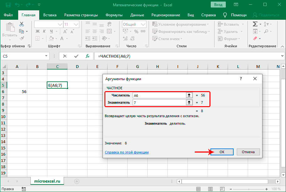 Для того, чтобы получить результат, требуется заполнить значения двух аргументов: Число и Делитель.