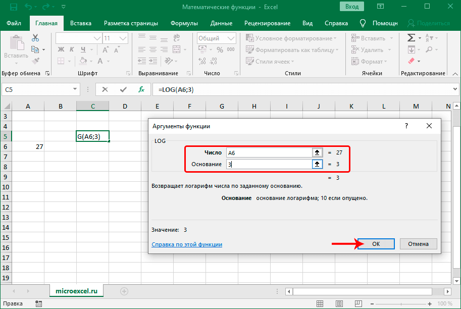 Необходимо заполнить два аргумента: Число и Основание логарифма (если его не указать, программа примет значение по умолчанию, равное 10).