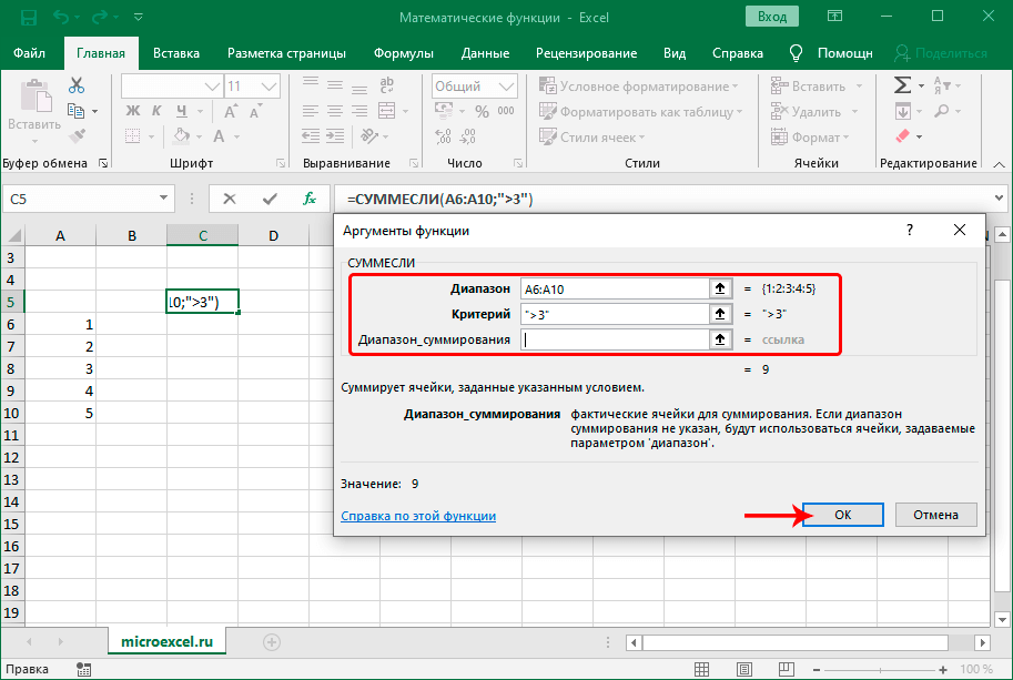 В аргументах функции указывается диапазон ячеек (вручную или путем выделения в таблице), значения которых нужно просуммировать. В качестве критерия можно задать следующие условия (в кавычках):