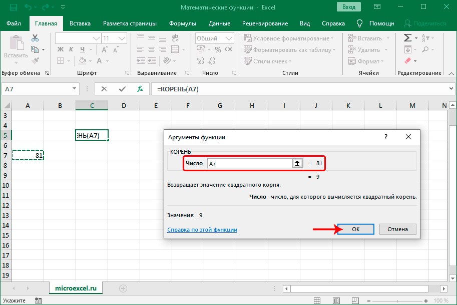 Для корректного расчета геометрических величин, Вам понадобятся познания в элементарных расчетах и некоторые из функций Excel. Так, функция КОРЕНЬ извлечет квадратный корень из заданного числа. Например, запишем: =КОРЕНЬ(121), и получим результат «11». Хотя правильным решением будет «11» и «-11», программа возвращает только положительный результат в таких случаях.