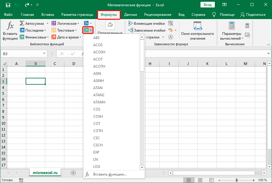 Примечание: Если мы, находясь во вкладке “Формулы”, в группе инструментов “Библиотека функций” нажмем по значку математических функций, сразу откроется список операторов, которые мы можем выбрать, минуя окно вставки функции.