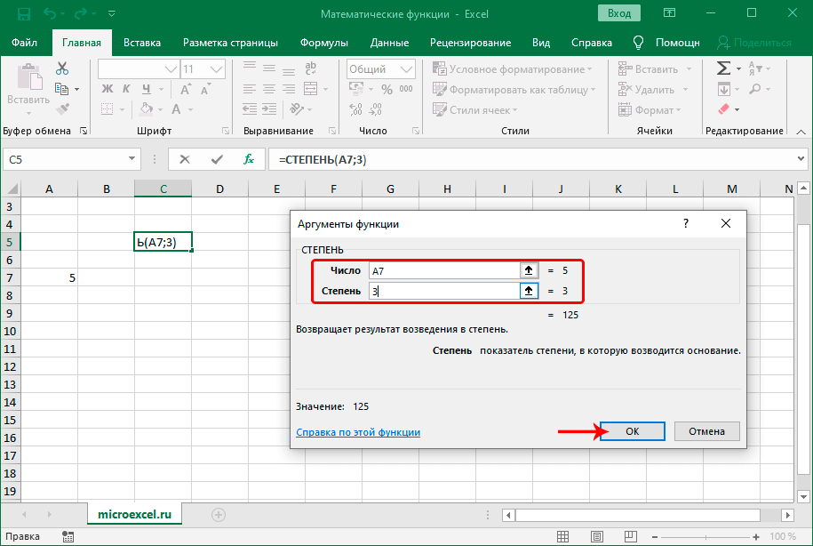 В аргументах функции указывается само число, а также, степень, в которую нужно его возвести.