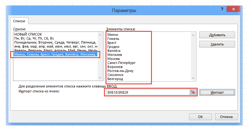 Как видно, их не много. Но легко добавить свой собственный. Можно воспользоваться окном справа, где либо через запятую, либо столбцом перечислить нужную последовательность. Однако быстрее будет импортировать, особенно, если данных много. Для этого предварительно где-нибудь на листе Excel создаем перечень названий, затем делаем на него ссылку и нажимаем Импорт.
