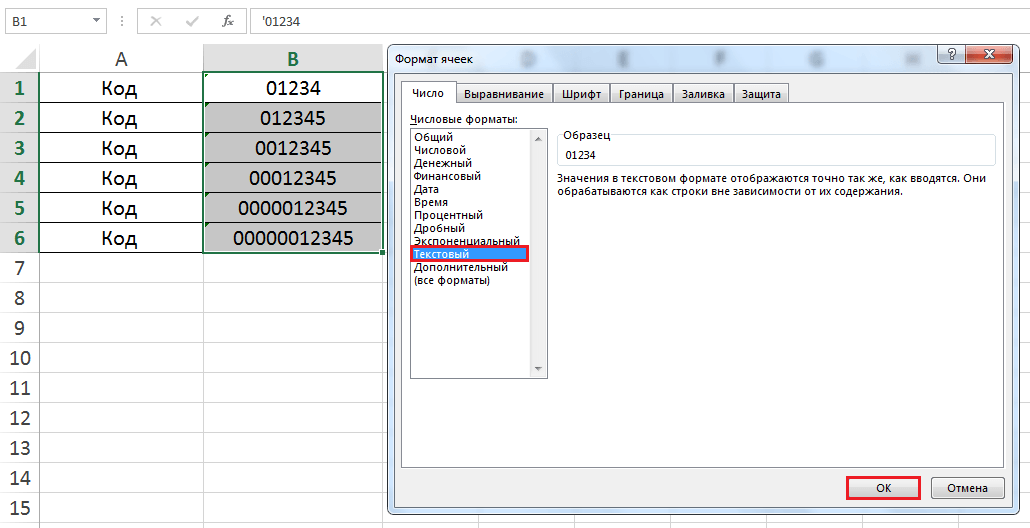 В окне параметров меняем формат на текстовый. Надо отметить, что в данном режиме любое число в ячейке будет отображаться так, как написано. Щелкните OK, а затем напишите значения с любым количеством нулей в начале.