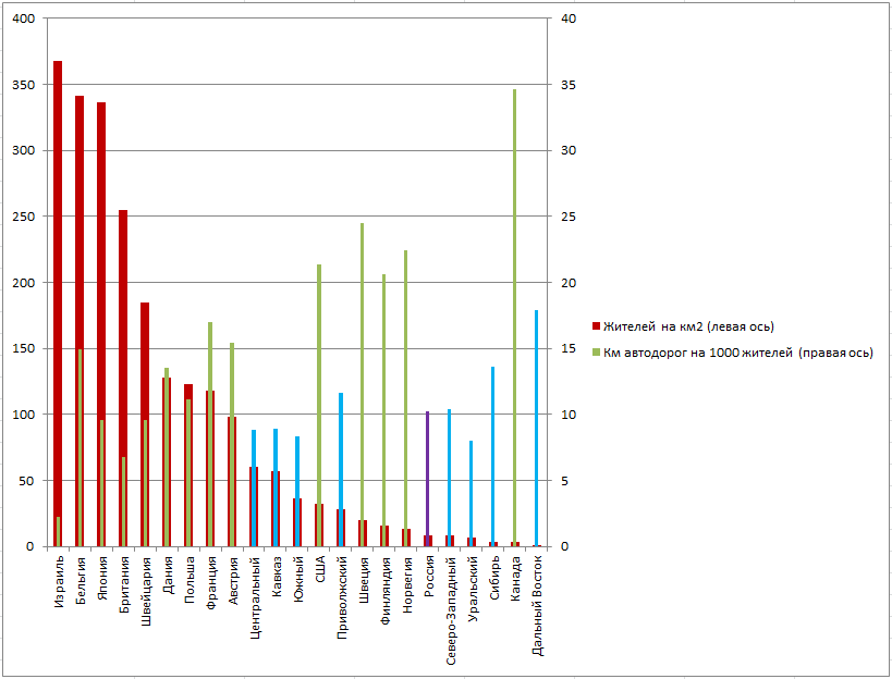 При сравнении длины дорог (как автомобильных, так и железных) на душу населения в так называемых развитых странах наблюдается следующая закономерность: чем меньше плотность населения, тем больше дорог приходится на одного жителя (или 1000 жителей — не важно). Об этом я писал в предыдущей части
