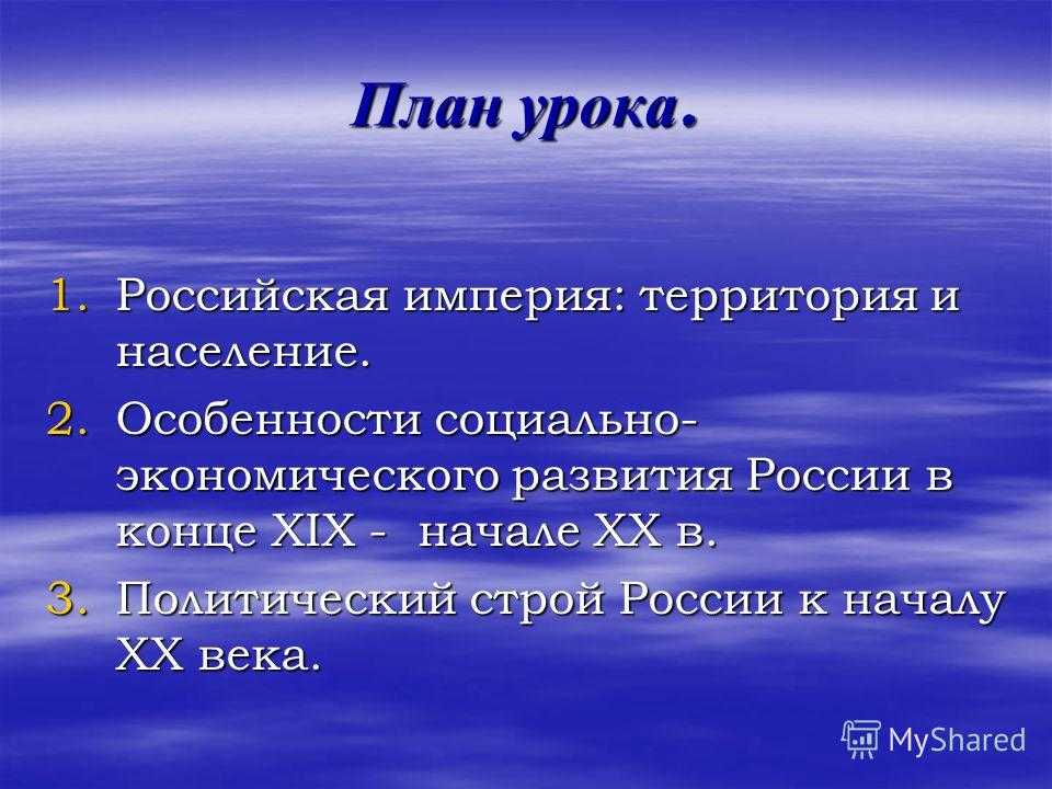План урока. 1.Российская империя: территория и население. 2.Особенности социально- экономического развития России в конце XIX — начале XX в. 3.Политический строй России к началу XX века.