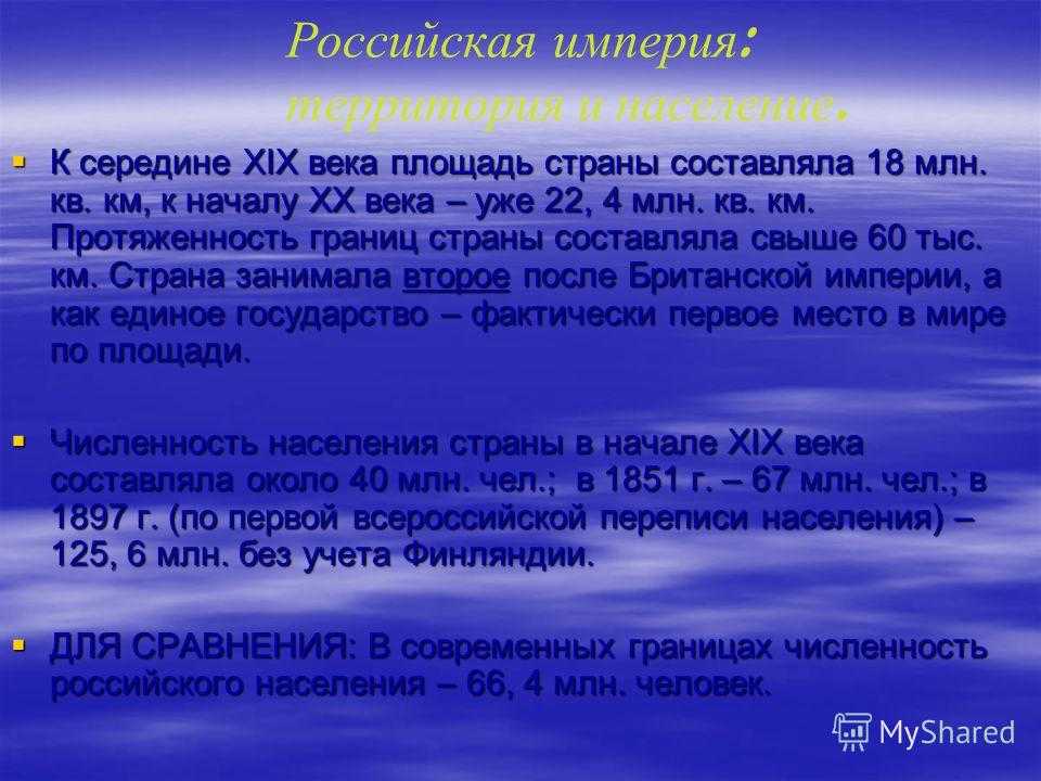 Российская империя : территория и население. К середине XIX века площадь страны составляла 18 млн. кв. км, к началу XX века – уже 22, 4 млн. кв. км. Протяженность границ страны составляла свыше 60 тыс. км. Страна занимала второе после Британской империи, а как единое государство – фактически первое место в мире по площади. К середине XIX века площадь страны составляла 18 млн. кв. км, к началу XX века – уже 22, 4 млн. кв. км. Протяженность границ страны составляла свыше 60 тыс. км. Страна занимала второе после Британской империи, а как единое государство – фактически первое место в мире по площади. Численность населения страны в начале XIX века составляла около 40 млн. чел.; в 1851 г. – 67 млн. чел.; в 1897 г. (по первой всероссийской переписи населения) – 125, 6 млн. без учета Финляндии. Численность населения страны в начале XIX века составляла около 40 млн. чел.; в 1851 г. – 67 млн. чел.; в 1897 г. (по первой всероссийской переписи населения) – 125, 6 млн. без учета Финляндии. ДЛЯ СРАВНЕНИЯ: В современных границах численность российского населения – 66, 4 млн. человек. ДЛЯ СРАВНЕНИЯ: В современных границах численность российского населения – 66, 4 млн. человек.