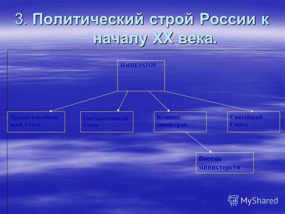 3. Политический строй России к началу XX века. Правительствую щий Сенат Государственный Совет Комитет министров Святейший Синод Восемь министерств ИМПЕРАТОР