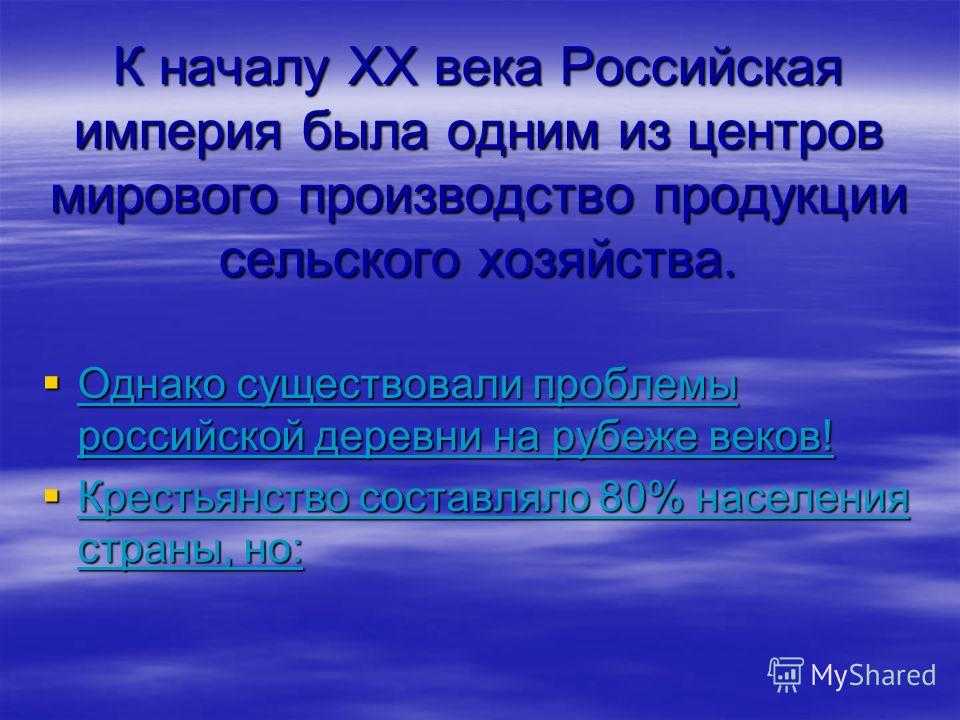 К началу XX века Российская империя была одним из центров мирового производство продукции сельского хозяйства. Однако существовали проблемы российской деревни на рубеже веков! Однако существовали проблемы российской деревни на рубеже веков! Крестьянство составляло 80% населения страны, но: Крестьянство составляло 80% населения страны, но: