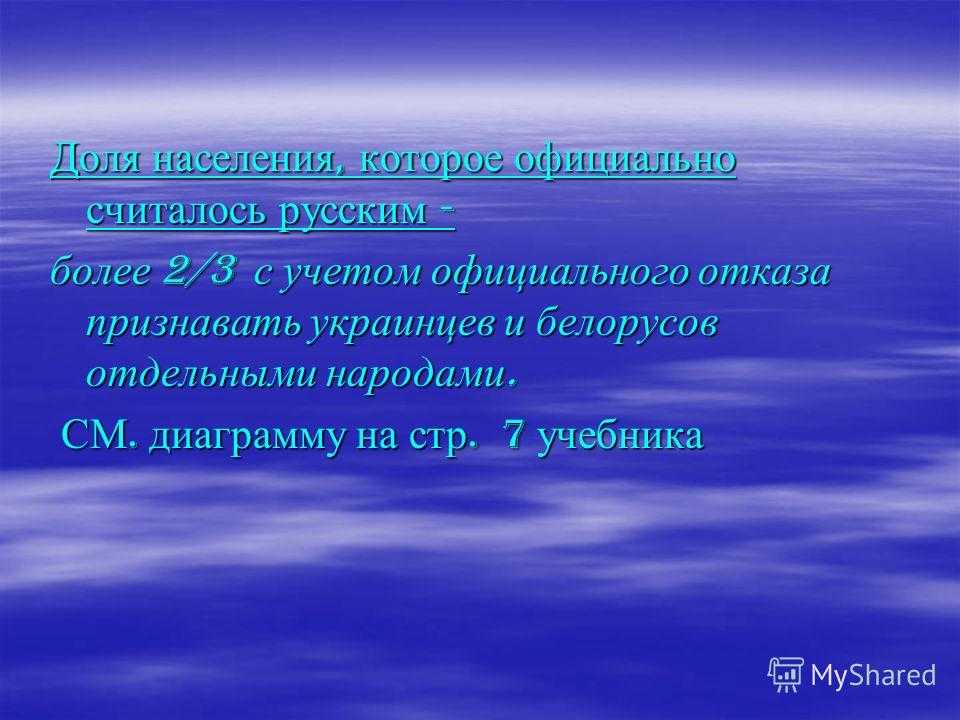 Доля населения, которое официально считалось русским — более 2/3 с учетом официального отказа признавать украинцев и белорусов отдельными народами. СМ. диаграмму на стр. 7 учебника СМ. диаграмму на стр. 7 учебника