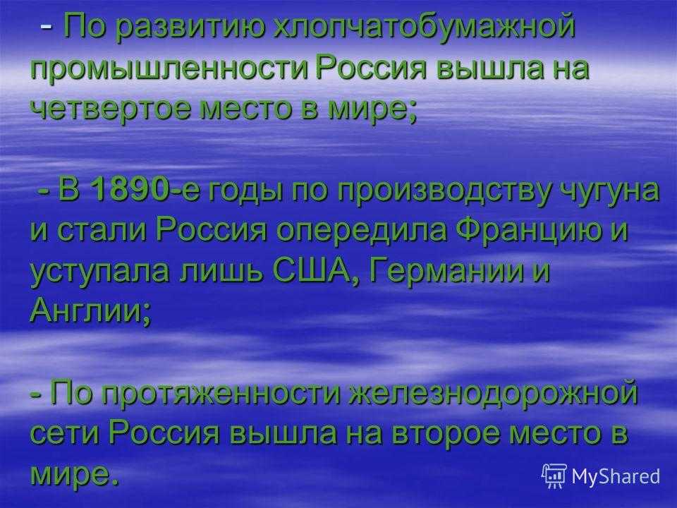 — По развитию хлопчатобумажной промышленности Россия вышла на четвертое место в мире ; — В е годы по производству чугуна и стали Россия опередила Францию и уступала лишь США, Германии и Англии ; — По протяженности железнодорожной сети Россия вышла на второе место в мире. — По развитию хлопчатобумажной промышленности Россия вышла на четвертое место в мире ; — В е годы по производству чугуна и стали Россия опередила Францию и уступала лишь США, Германии и Англии ; — По протяженности железнодорожной сети Россия вышла на второе место в мире.