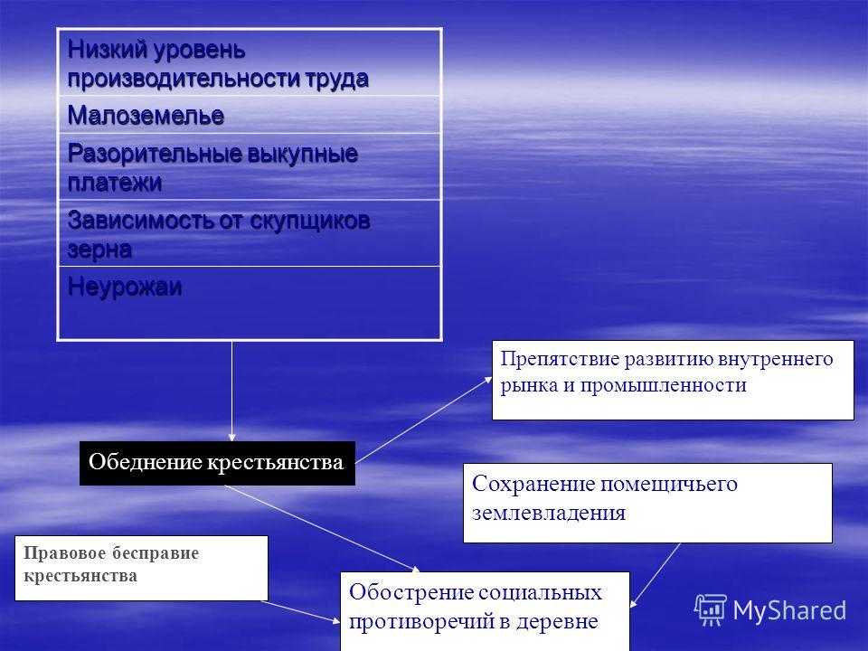 Низкий уровень производительности труда Малоземелье Разорительные выкупные платежи Зависимость от скупщиков зерна Неурожаи Обеднение крестьянства Препятствие развитию внутреннего рынка и промышленности Правовое бесправие крестьянства Сохранение помещичьего землевладения Обострение социальных противоречий в деревне