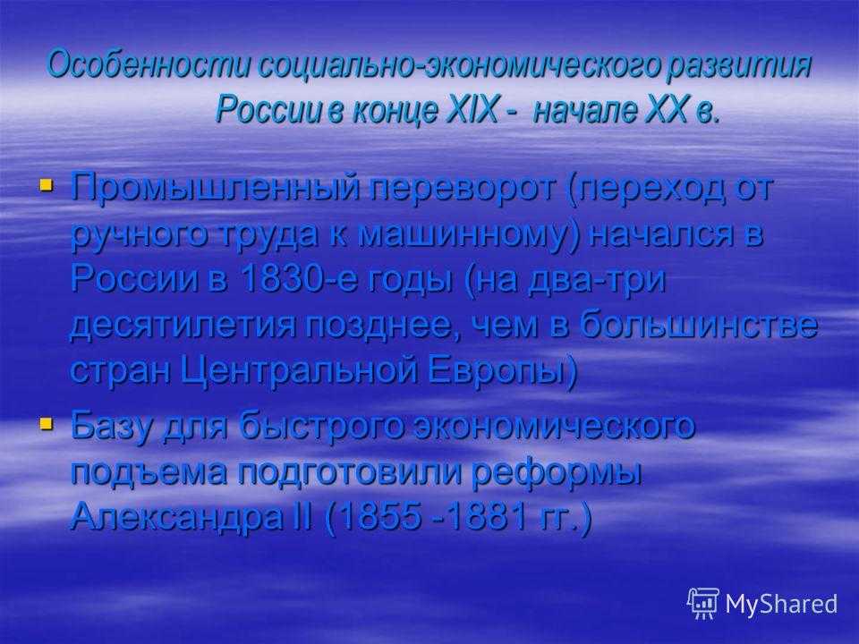 Модернизация охватила все ведущие страны, но у российской модернизации были свои особенности. Рассмотрим самые важные. Начнём с экономики.