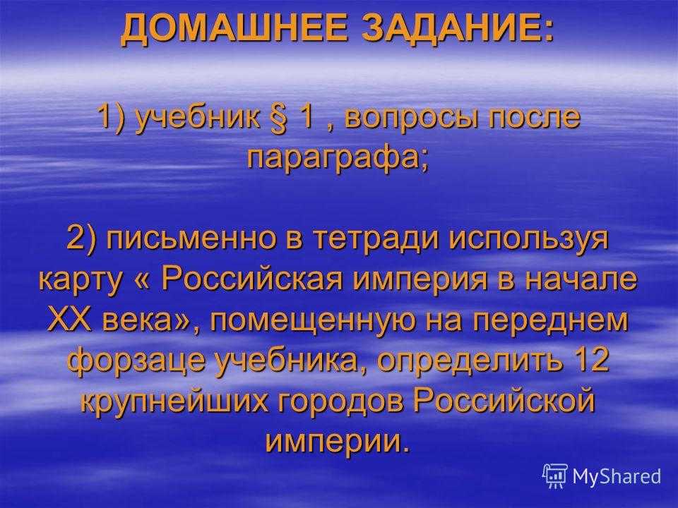 ДОМАШНЕЕ ЗАДАНИЕ: 1) учебник § 1, вопросы после параграфа; 2) письменно в тетради используя карту « Российская империя в начале XX века», помещенную на переднем форзаце учебника, определить 12 крупнейших городов Российской империи.