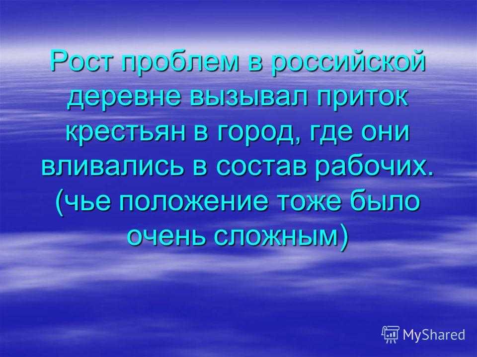 Рост проблем в российской деревне вызывал приток крестьян в город, где они вливались в состав рабочих. (чье положение тоже было очень сложным)