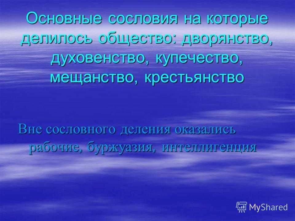 Основные сословия на которые делилось общество: дворянство, духовенство, купечество, мещанство, крестьянство Вне сословного деления оказались рабочие, буржуазия, интеллигенция