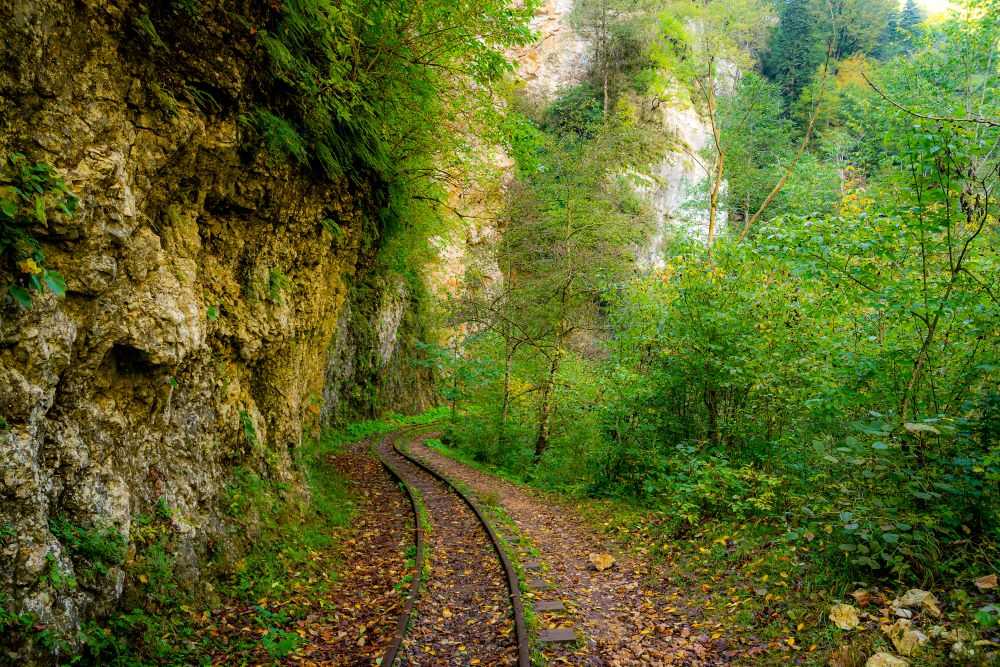 Только представьте: узкая лента рельсов вьётся меж высоких разноцветных скал. В расщелинах и на вершинах — зелень реликтовых деревьев, а внизу на обрыве дороги шумит молочно-голубой поток реки Курджипс. За каждым поворотом скалистой стены — то водопад, то каменная глыба, затаились, как застывшие сказочные великаны. Того и гляди, в лучах солнца появится эльф верхом на коне или матёрый тролль выскочит из показавшейся вдали пещеры.