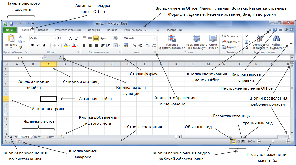 Рис. 1 Основные элементы интерфейса Microsoft Excel