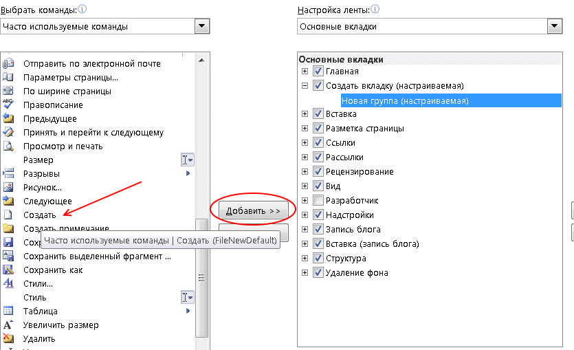 - В левом столбце выбирается необходимая команда, например «Создать», в правом – место размещения. В нашем случае это «Новая группа (настраиваемая)». Выбранные пункты Word подсвечивает синим.