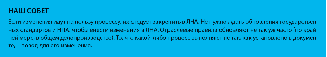 В отраслях, где с нормами и правилами строго (например, банки или строительство), необходимо готовить изменения в ЛНА заранее, еще до вступления в силу новых нормативных актов, и вводить их в действие одновременно с «законодателем моды».