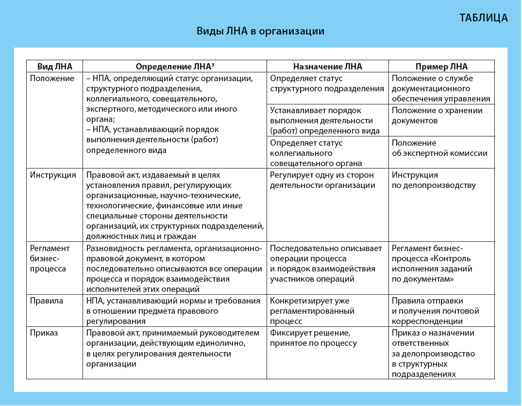 Самые распространенные виды ЛНА, действующие в сфере документационного обеспечения управления, представлены в Таблице.