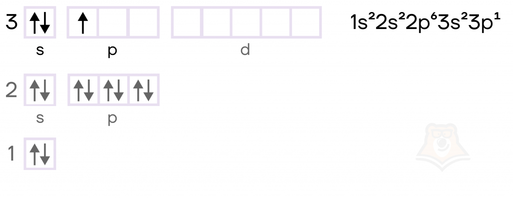 - Его электронная конфигурация, то есть порядок расположения электронов по различным электронным оболочкам атома, в основном состоянии имеет вид 3s23p1.