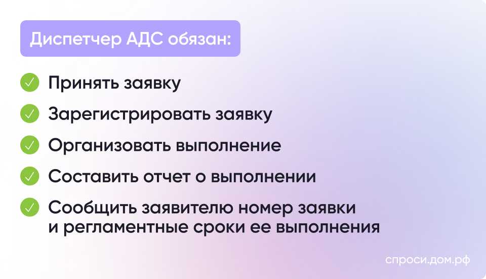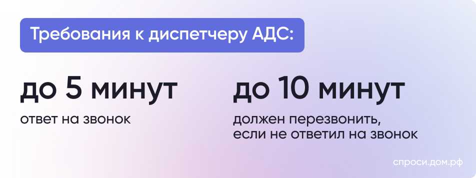 Аварийно-диспетчерские службы работают в круглосуточном режиме без выходных. Диспетчер АДС должен ответить на звонок в течение 5 минут или перезвонить в течение 10 минут, если не смог принять вызов сразу.