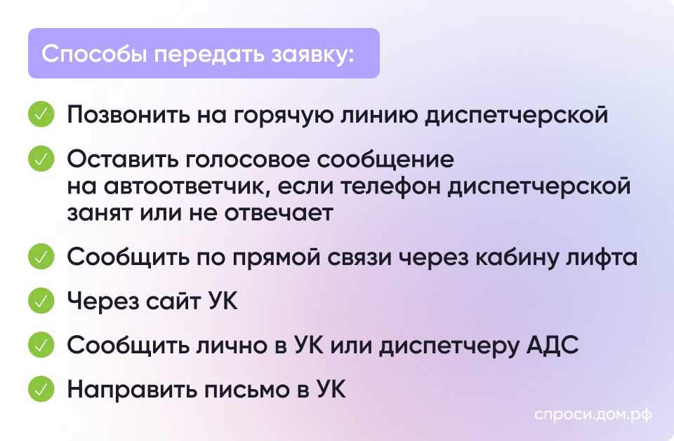 Задача диспетчера – прием заявок от жителей об авариях и поломках. Обращения принимаются по телефону, устно с переговорных устройств в кабинетах лифта.