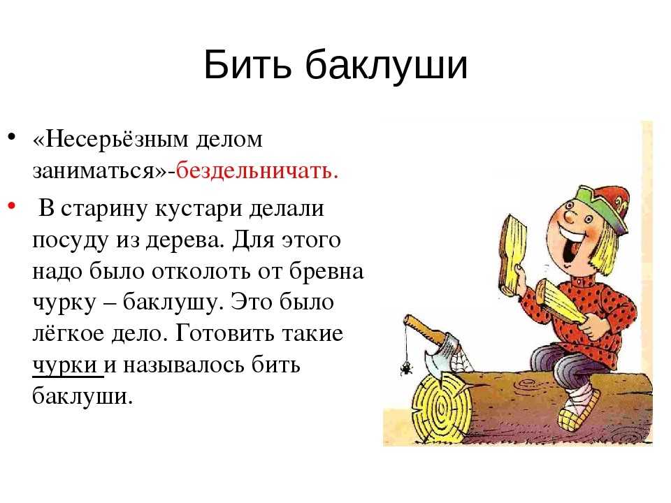 Выражение «бить баклуши» — как раз один из самых таких примеров. В русском языке этот фразеологизм используется, если человек ленится, не хочет учиться, работать, праздно проводит время, отлынивает от дел и бездельничает. В этом случае ему вполне можно сказать: «Хватит бить баклуши!». И ведь каждый человек поймет, что имеется в виду, даже если он не знает, что такое «баклуши»!