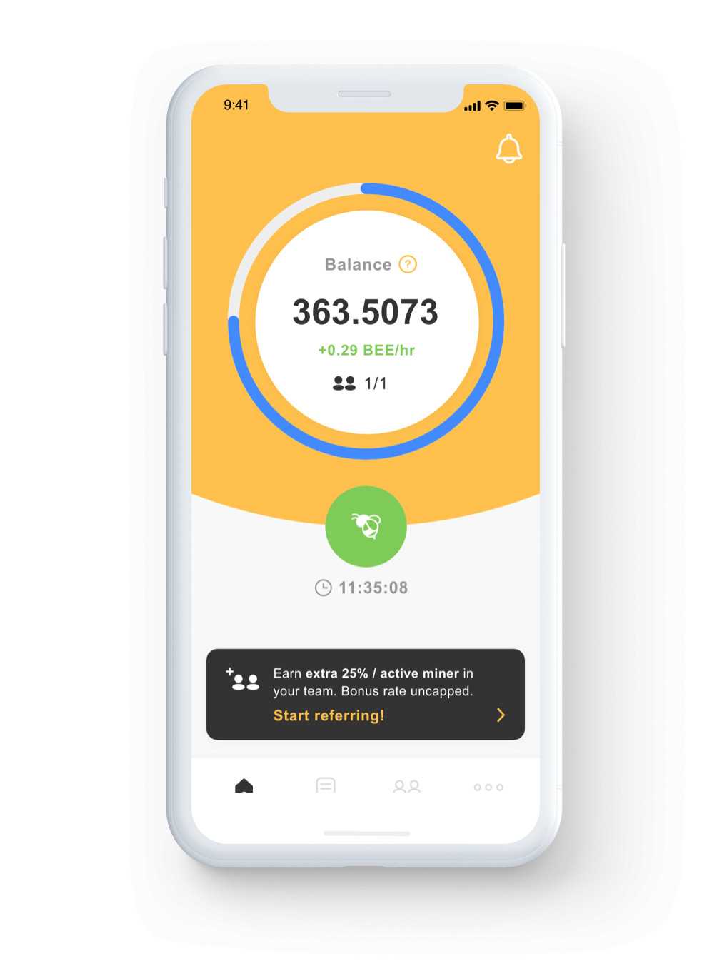 За два месяца в приложении уже 4 млн юзеров, когда будет 10 млн рейты майнинга токенов упадут на 50%, когда будет 100 млн — майнинг токенов прекратится. Без инвайт кода, майнить не получится (инвайт код ниже). Сам процесс майнинга довольно простой. Вам нужен лишь смартфон и 2 минуты времени. После регистрации, нажимаете раз в 24 часа на кнопку в виде пчелки и процесс майнинга запущен. Чем больше людей пригласите, тем больше токенов сможете майнить.
