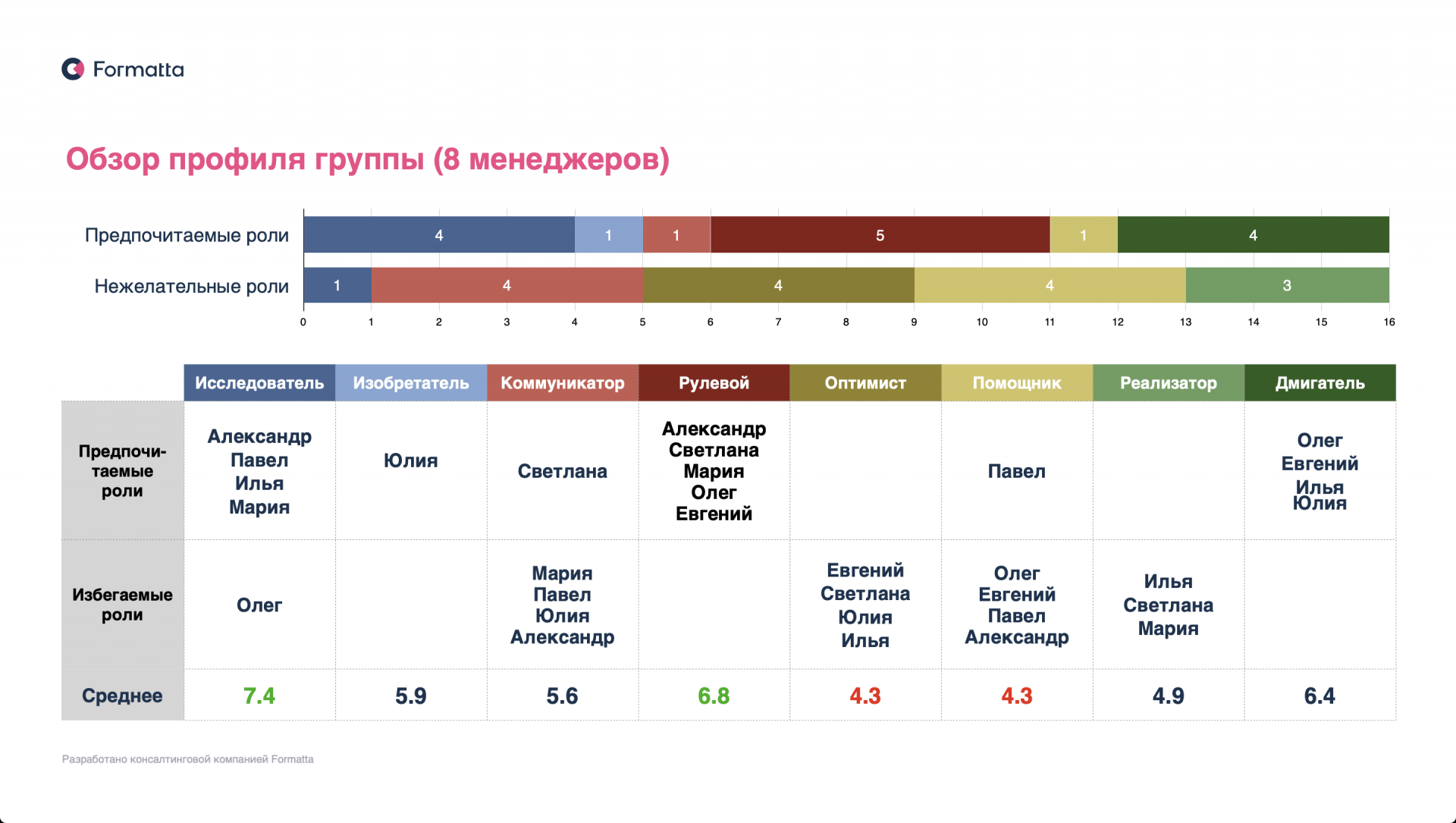 Знакомство с отчётом помогает сотрудникам понять сильные и слабые стороны своих ролей и их комбинации, оценить пользу, которую они могут принести команде, и осознать, за что им вообще лучше не браться, чтобы не мешать другим