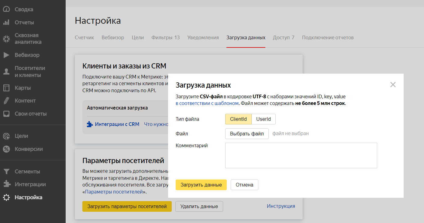 Чтобы передать идентификатор, загрузив CSV-файл, достаточно перейти в раздел «Настройка» — «Загрузка данных» — «Загрузка параметров посетителей» — в типе файла выбрать «User ID» — «Загрузить данные».