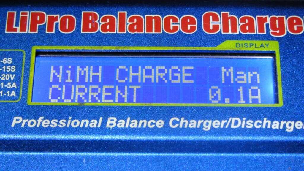 Подключаем к АКБ к Imax B6, настраиваем ток заряда 0.1A ”NiMH CHARGE Man CURRENT 0.1A”
