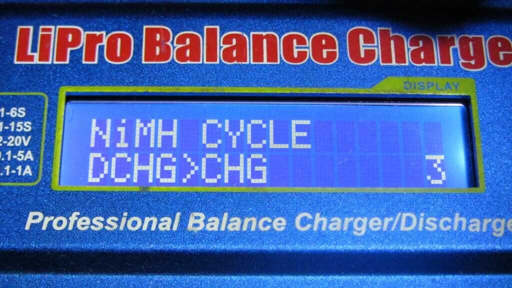 Выбираем и настраиваем режим “циклирования” – “NiMH CYCLE DCHG>CHG 3″ (режим циклирования, разряд-заряд, количество циклов 3).