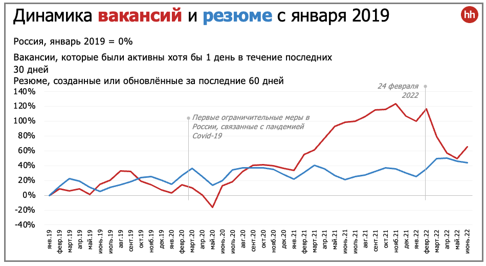 С 24 февраля 2022 года количество вакансий пошло на спад, но к июню ситуация начала стабилизироваться. По сравнению с январём 2019 года, число предложений от работодателей выросло на 65%, резюме стало больше на 44%.