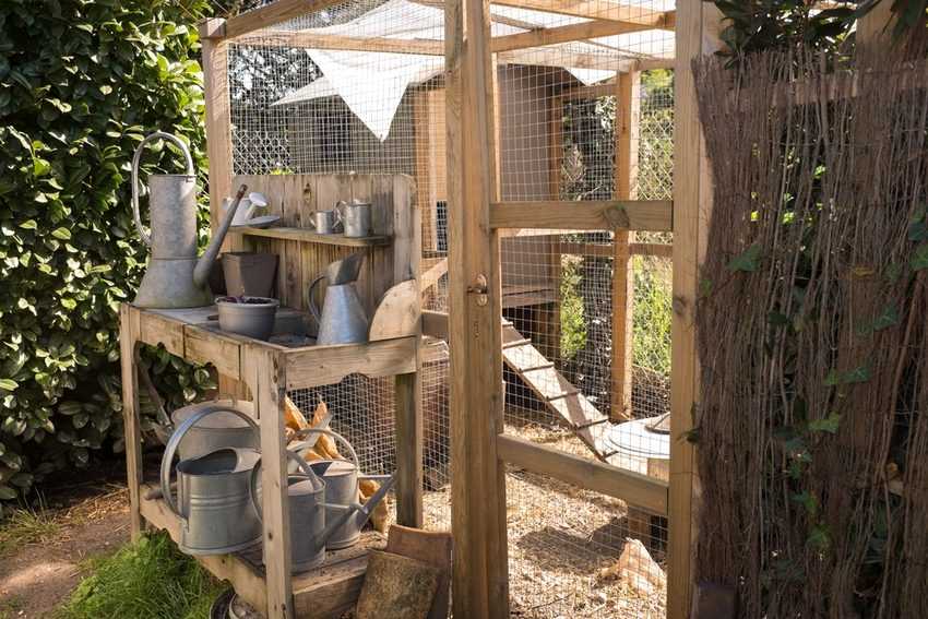 Удобно располагать стаю секциями по 10-15 голов. Для этого внутри курятник разграничивают балками и сетками на импровизированные вольеры. Территорию выгула также огораживают высокими сетками (для «летучих» кур с капроном).