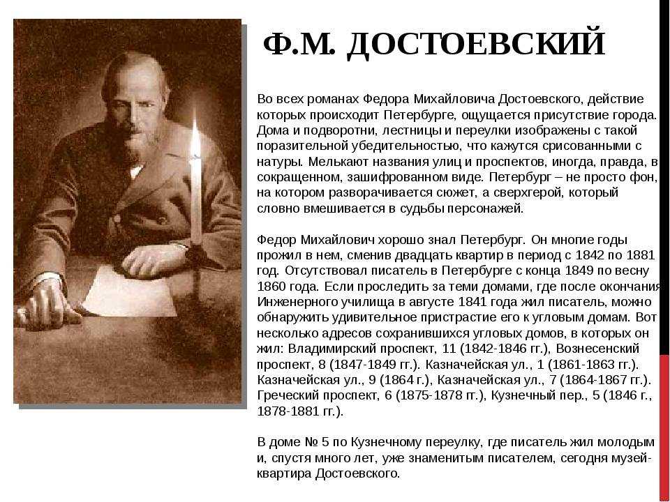 Петербург является важным местом в жизни и творчестве Фёдора Достоевского, и это отражено во множестве памятников, посвященных великому писателю.