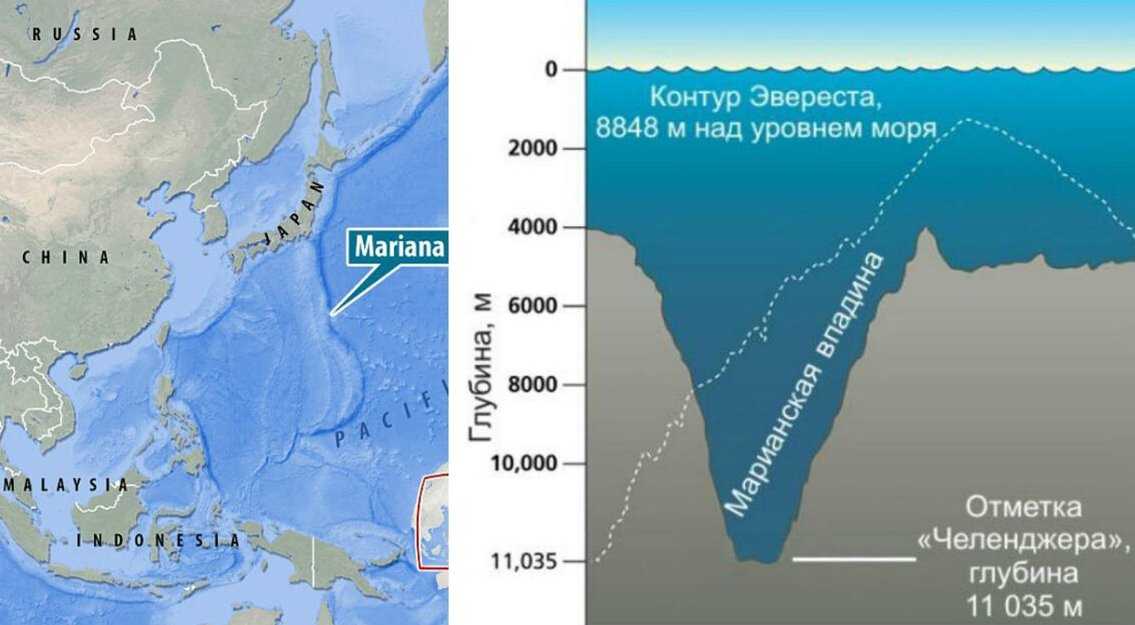 «Бездна Челленджера» – самое глубокое место, находится в тихоокеанском Марианском желобе, его глубина составляет 11 км. Если на дне расположить самую высокую в мире гору Эверест, то выше останется еще 3 км.